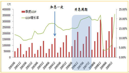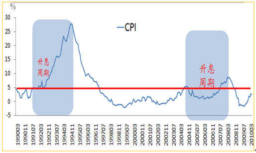 3.8、9月底經(jīng)濟(jì)數(shù)據(jù)繼續(xù)向好,9月CPI或?qū)⒃俅紊蠐P(yáng),通脹預(yù)期增加。此前中國(guó)經(jīng) 濟(jì)呈現(xiàn)下滑勢(shì)頭,8月數(shù)據(jù)明顯好轉(zhuǎn),9月數(shù)據(jù)預(yù)計(jì)繼續(xù)向好,這種情況下,政策風(fēng)向由防范經(jīng)濟(jì)增速下滑轉(zhuǎn)向控制通脹。之前我國(guó)的負(fù)利率已持續(xù)了十幾個(gè)月,可 以說(shuō),加息是情理之中的。近期公布的中央對(duì)"十二五規(guī)劃"的建議中,政府下調(diào)經(jīng)濟(jì)增速目標(biāo)至7%-8%,工作重心轉(zhuǎn)移到加大經(jīng)濟(jì)結(jié)構(gòu)調(diào)整和節(jié)能減排,發(fā)展 新興戰(zhàn)略產(chǎn)業(yè)上來(lái),降低國(guó)民經(jīng)濟(jì)對(duì)房地產(chǎn)等行業(yè)的依賴程度。歷次加息的啟動(dòng)在CPI漲幅5%左右。
