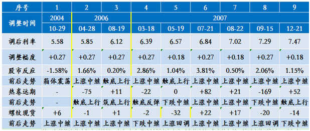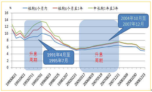 從上世紀(jì)90年至今有兩個(gè)加息周期,一個(gè)是1991年4至1995年7月,另一個(gè)是2004年10至2007年12月。短中長(zhǎng)期利率都進(jìn)行了上調(diào),幅度在18點(diǎn)、27點(diǎn)不等。