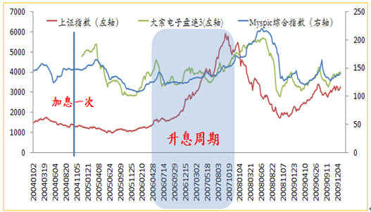 在2004-2007升息周期內(nèi),宏觀經(jīng)濟(jì)穩(wěn)定高速增長(zhǎng),股市稍作休整后,持續(xù)走高, 從998點(diǎn)起步,最高沖到6124點(diǎn),翻了6倍多。加息前期,鋼鐵行業(yè)受制于下游行業(yè)(房地產(chǎn)、汽車等)需求的疲弱,基本維持低位震蕩的走 勢(shì),Myspic指數(shù)在100-150的小區(qū)間運(yùn)行,大宗電子盤熱卷也基本在區(qū)間震蕩。滯后的鋼市終于在06年底07年初的加息后期,開(kāi)始持續(xù)2年半的上 漲行情。