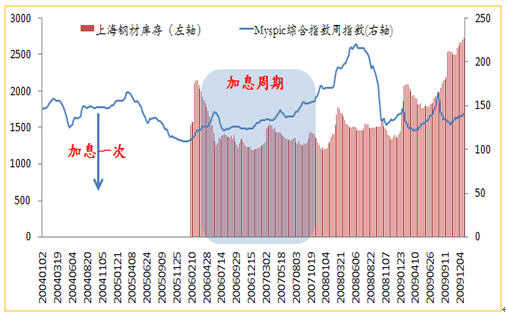 圖表8 鋼材庫(kù)存、鋼價(jià)與加息的關(guān)系