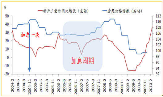 3.對(duì)房地產(chǎn)行業(yè)的影響。2004年,國(guó)家以前所未有的力度大力整頓土地市場(chǎng),政府政 策圍繞抑制投資過(guò)熱和房地產(chǎn)投機(jī),重點(diǎn)集中在土地與金融政策兩個(gè)方面。通過(guò)控制房地產(chǎn)供應(yīng)的源頭、規(guī)范房地產(chǎn)市場(chǎng)秩序、通過(guò)加息等手段來(lái)平衡房地產(chǎn)市場(chǎng)供 求等幾個(gè)方面全方位對(duì)房地產(chǎn)市場(chǎng)進(jìn)行規(guī)范。2004年10至2007年12月升息期間,隨著房地產(chǎn)行業(yè)政策的調(diào)控力度加大,致使新開(kāi)工面積和房屋價(jià)格指數(shù) 維持低位運(yùn)行。